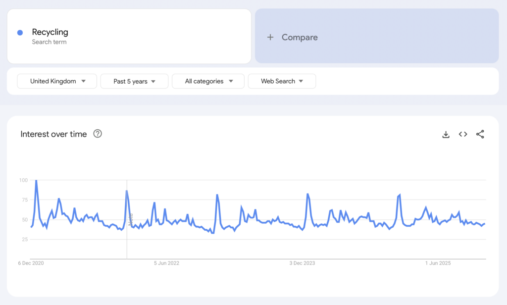 This research was inspired by a clear pattern in Google Trends data: every year, searches for “recycling” spike sharply during the week after Christmas, known as “Twixmas.” People want to recycle more during this period, but something is preventing them.