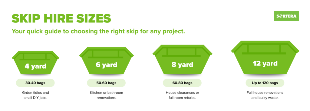 - 4 Yard Skip — Small Projects: 30–40 bin bags. Best for garden tidies and DIY jobs.